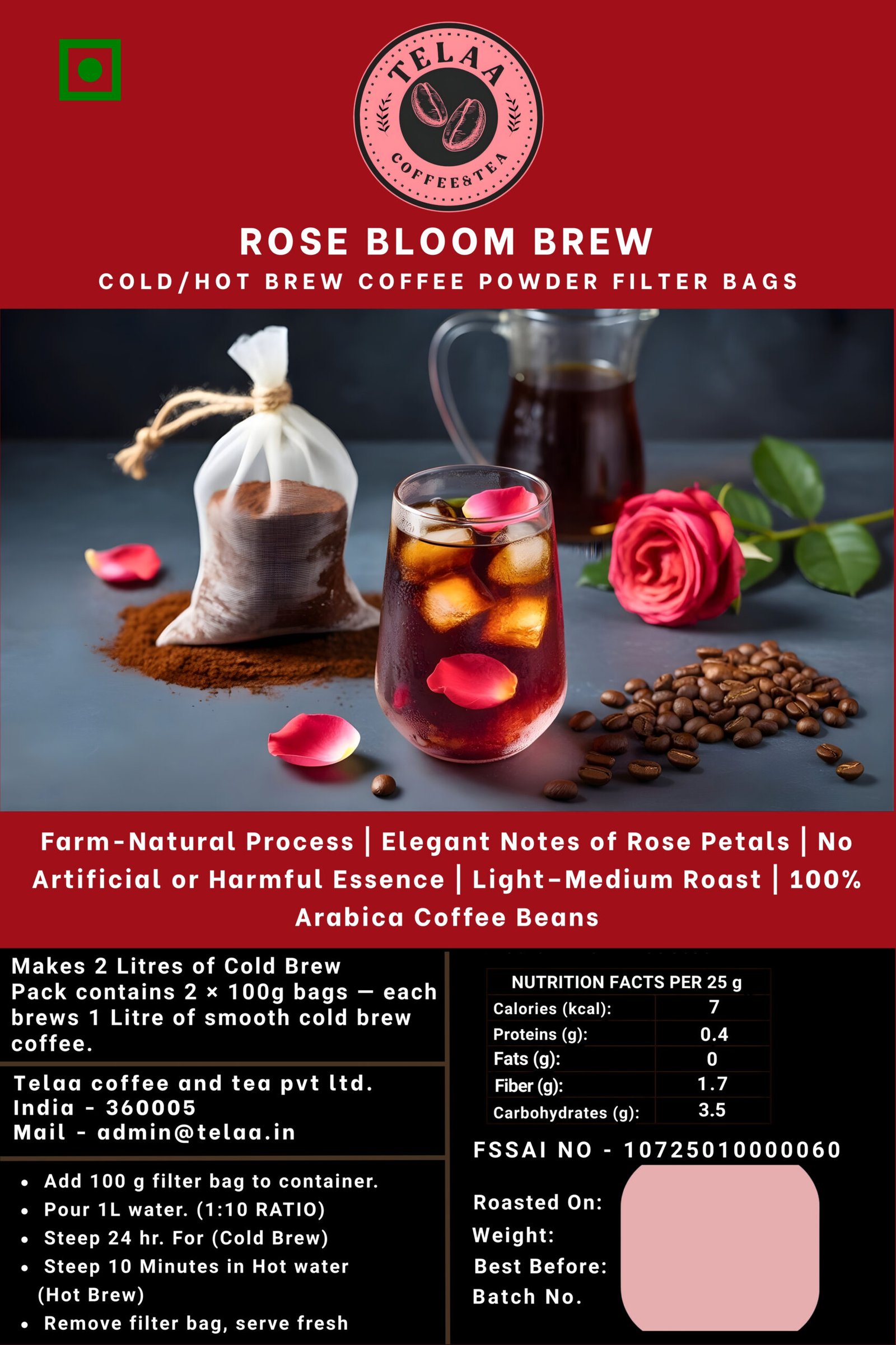 Coffee, Cold Brew Ready to Pour Bags (Specialty), Roasted Coffee Powder/Cold Brew SolutionRose Bloom Coffee — 200g Ground or Cold/Hot Brew Bag | V60, Press, Espresso