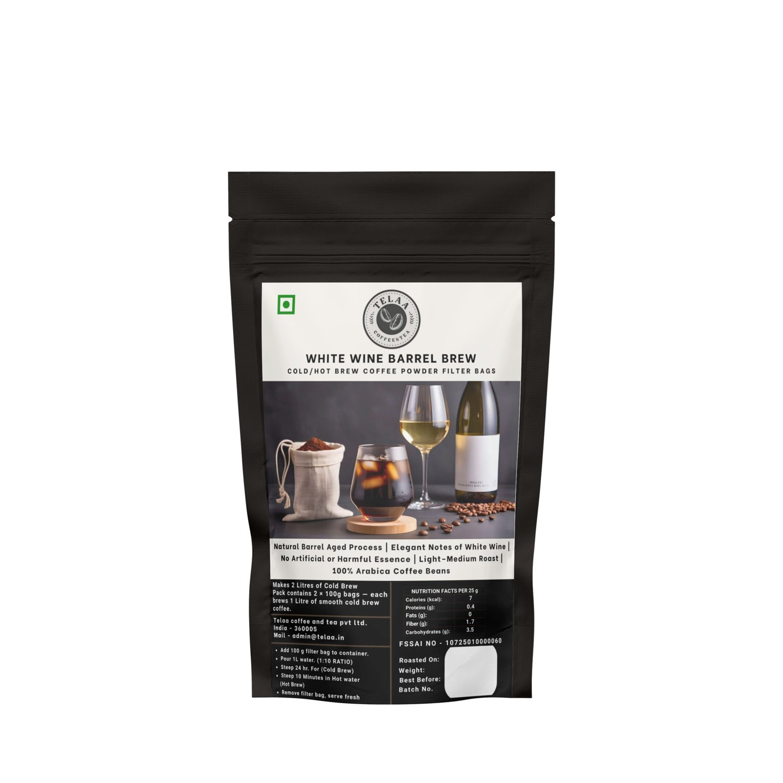 Experience the luxury of Telaa White Wine Barrel Cold/Hot Brew, crafted from 100% Arabica beans naturally aged in authentic imported oak wine barrels. This unique process infuses subtle white wine notes, creating a smooth, aromatic cold brew unlike any other. Free from artificial flavors or harmful essences.